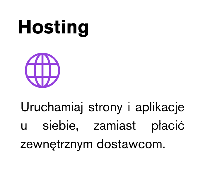 Profesjonalna infrastruktura w przystępnej cenie. Rozwijaj firmę bez miesięcznych opłat za chmurę i zachowaj pełną kontrolę nad swoimi zasobami.